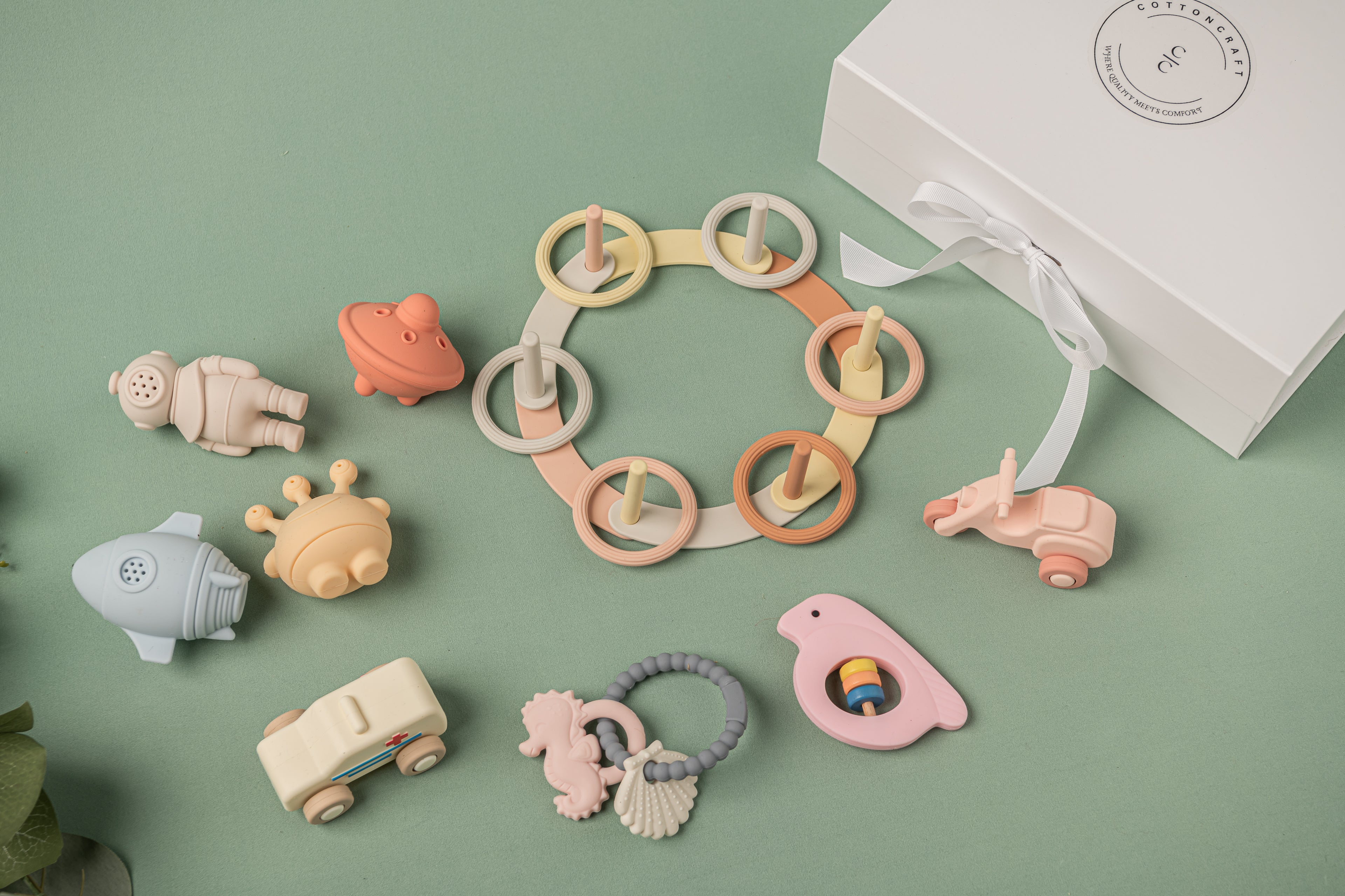 Beautifully crafted baby toy set made with BPA-free silicone & natural wood—safe, stylish, and eco-friendly! Perfect for little explorers.